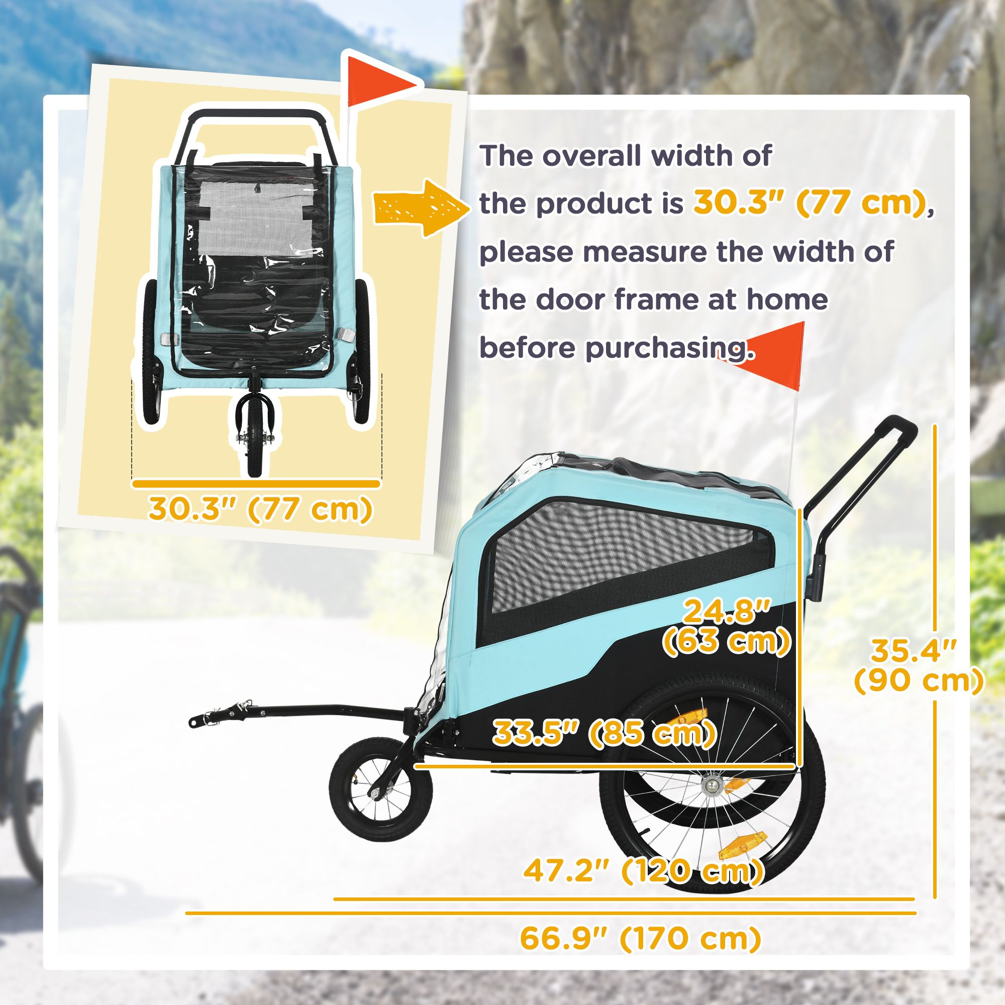 • • Overall Dimensions: 66.9"L x 30.3"W x 35.4"H (170 x 77 x 90 cm) (trailer). 47.2"L x 30.3"W x 35.4"H (120 x 77 x 90 cm) (stroller)