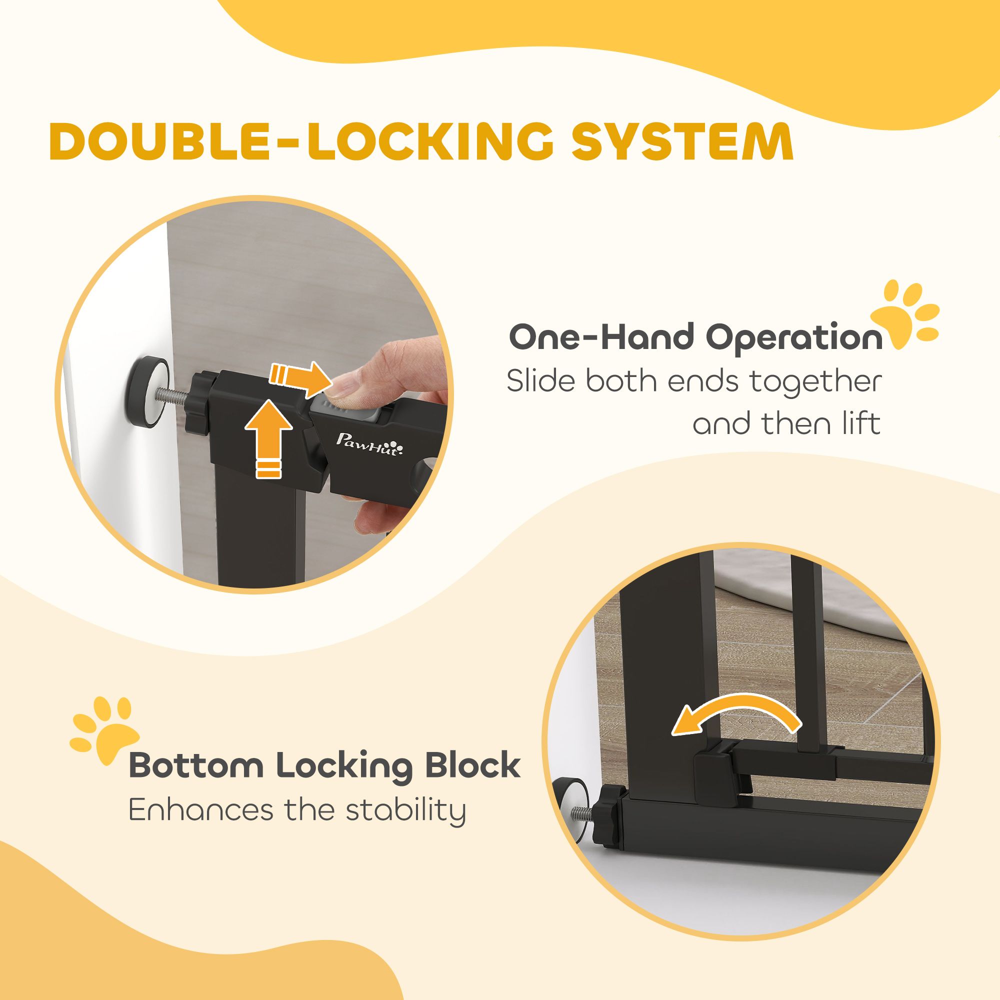 Keep pets away from rooms when required with the Pawhut dog gates with walk through door. Made from metal with lead-free treated surface for strength and safety. Ranges from 29.5" to 40.6"(75 - 103 cm) wide, allowing it to fit into different sized spaces with ease. Slide and lift, the handle is easy to open, allowing you to pass through quickly without your pet escaping for security. Double locking mechanism ensures your pet secured in a place to provide maximum safety.