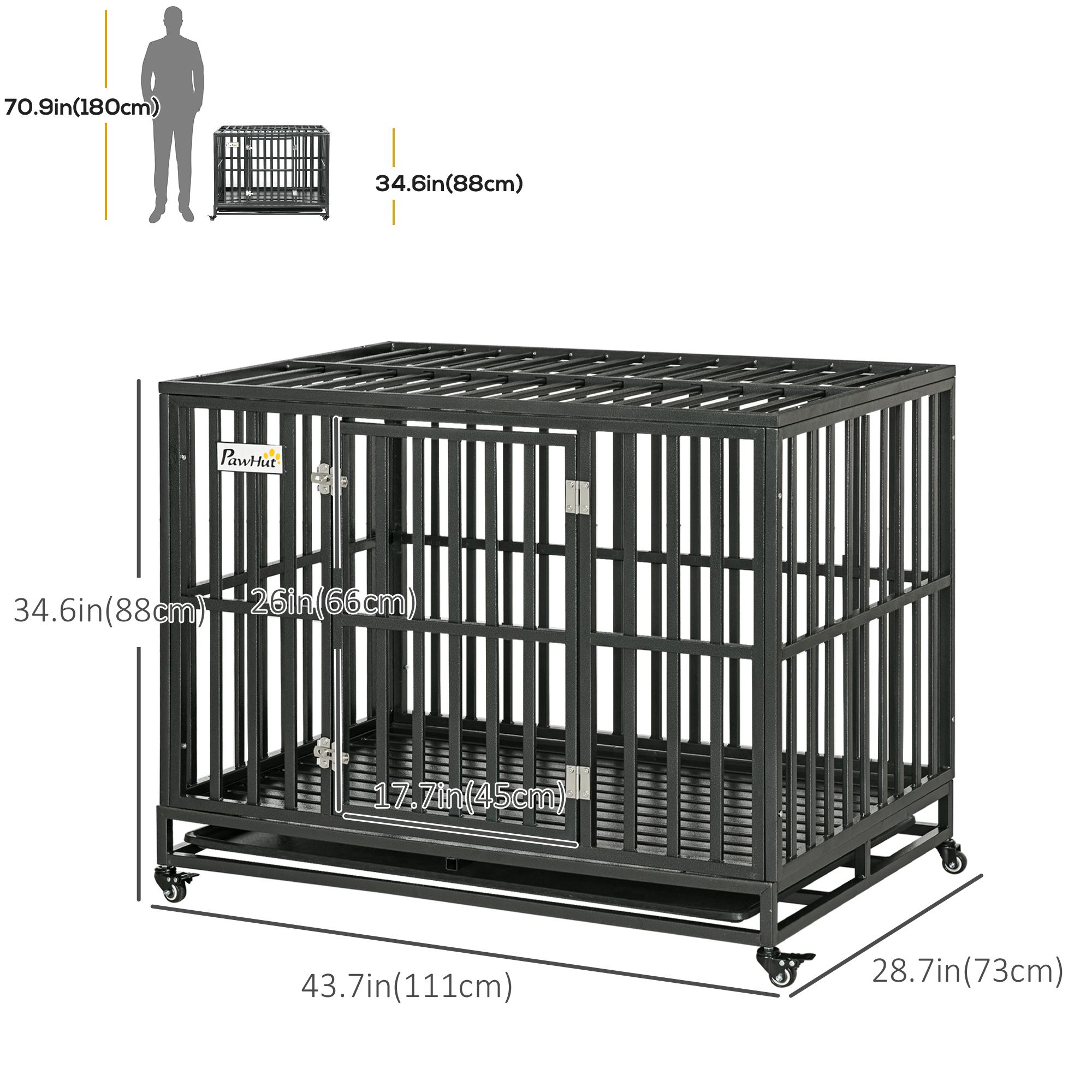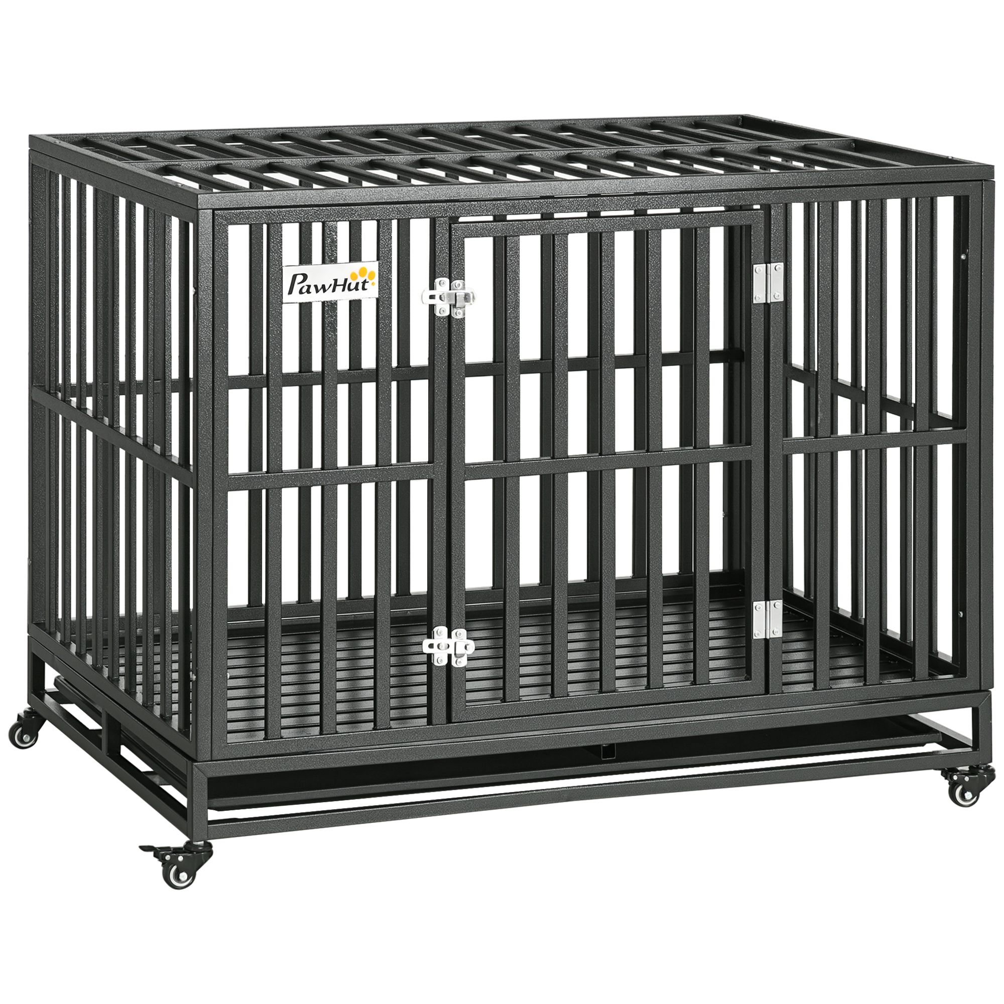 This heavy-duty dog kennel from PawHut provides a comfortable and secure home for your furry friend. Constructed with solid steel gauge tubes and frame. Each bar is securely welded to the frame for long-lasting strength and durability. A convenient slide-out panel is included for easy cleaning and maintenance. This dog kennel has rolling caster wheels for easy transportation and movement. This crate is a great tool for keeping your pets safe and secure while you are away.