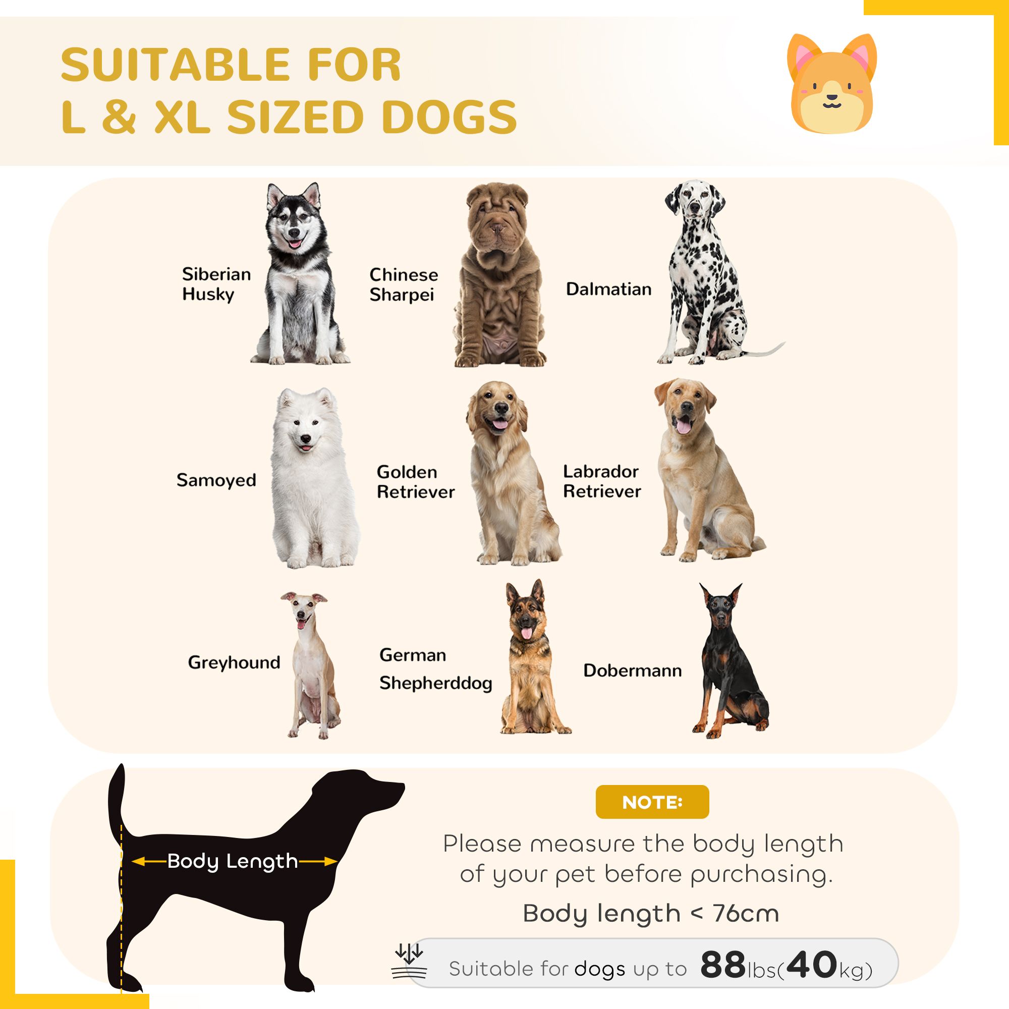 • • Suitable for large and extra large dogs, less than 29.9" (76 cm) in length, and less than 88 lbs(40 kg) in weight