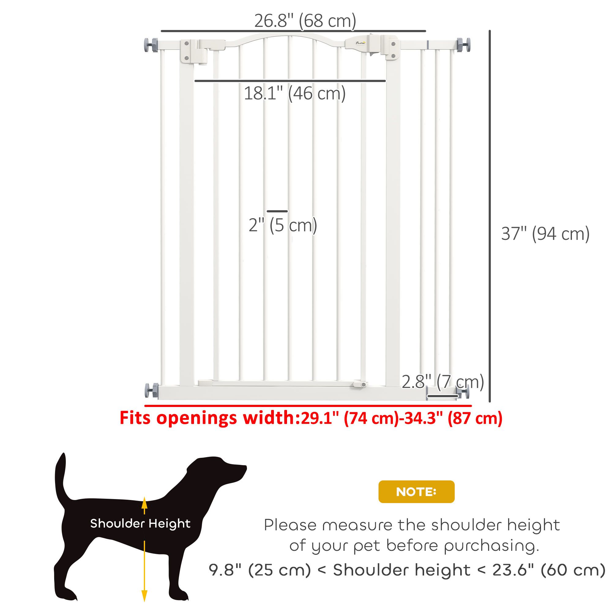 Keep pets away from specific places easily with this safety gate from PawHut. It's made from metal for strength, and its width can be adjusted between 29.1" (74 cm) and 34.3" (87 cm), meaning it will fit properly in door frames and other passages. Fitted with a middle door to pass when needed, the slide-and-lift handle is easy to use so you can walk through quickly. Two rotating locks on the bottom allow the door to opened both ways, with a double locking mechanism to finish for extra safety.