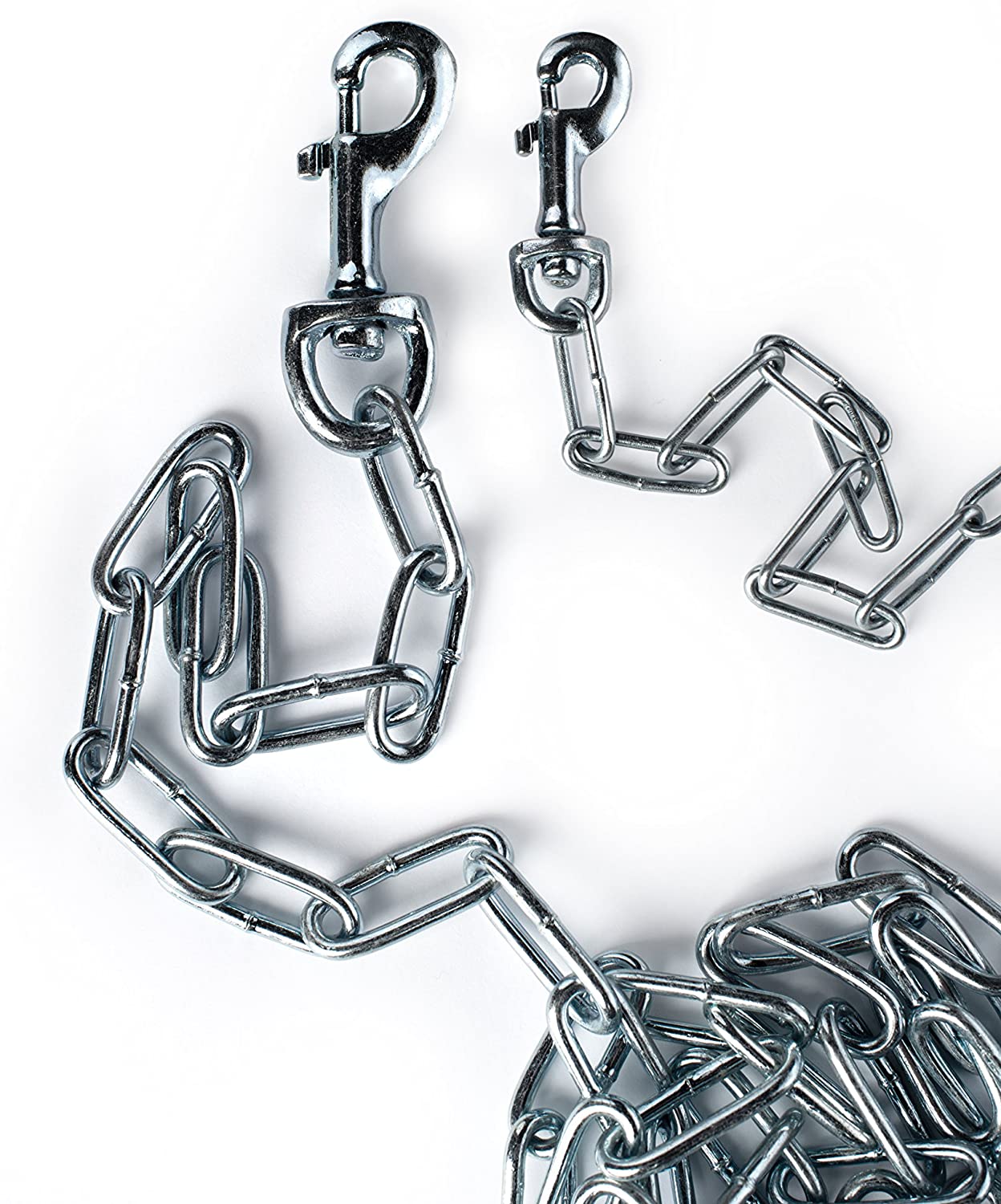 Prevue Pet Products heavy-duty 30Æ tie-out chain 2126 is designed for dogs up to 150 lbs. Zinc plated welded oval links are strong, ensuring your dog stays safe and secure. Premium quality die-cast iron swivel bolt snaps at both ends connect easily and prevent tangling. Heavy duty tie out chain is 30 foot long and 3.8 mm in diameter.